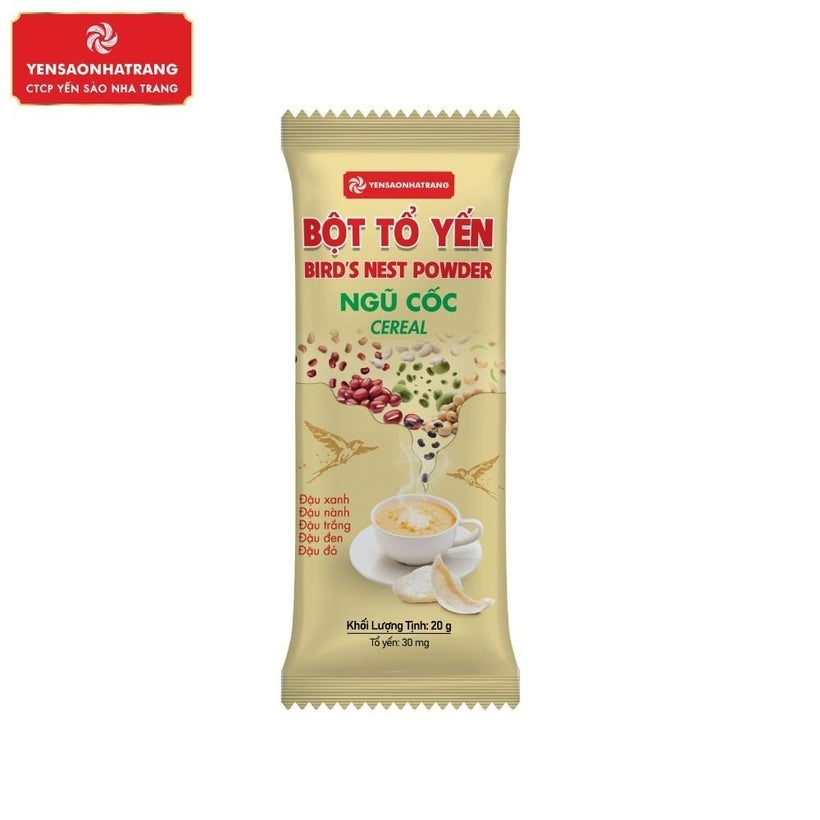 Bột tổ yến ngũ cốc Yến Sào Nha Trang kết hợp 30mg tổ yến với 40% ngũ cốc (đậu xanh, đậu nành, đậu trắng, đậu đen, đậu đỏ), cùng bột nước cốt dừa, đường phèn, giúp bổ sung năng lượng, hỗ trợ tiêu hóa, tăng miễn dịch và hấp thu canxi.