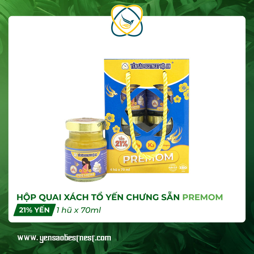 Tổ yến chưng sẵn BESTNEST Hội An 21% Premom là sản phẩm dinh dưỡng cao cấp dành riêng cho phụ nữ mang thai từ tháng thứ 4 và phụ nữ sau sinh. Với 21% tổ yến nguyên chất kết hợp cùng collagen, vitamin B9 và K2, sản phẩm hỗ trợ mẹ bầu tăng cường sức đề kháng, giảm căng thẳng, giảm nghén, ngăn ngừa rạn da và thâm nám trong thai kỳ.