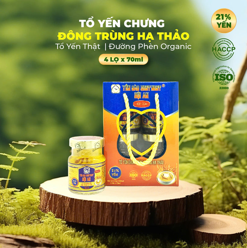 Tổ yến chưng sẵn BESTNEST Hội An Premium 21% Đông trùng hạ thảo là sự kết hợp tinh túy giữa tổ yến nguyên chất (21%) cùng đông trùng hạ thảo nguyên sợi (3,5%), tạo nên sản phẩm bồi bổ sức khỏe toàn diện, giúp tăng đề kháng, cải thiện giấc ngủ, đẹp da, sáng mắt và tốt cho tim mạch, gan thận.